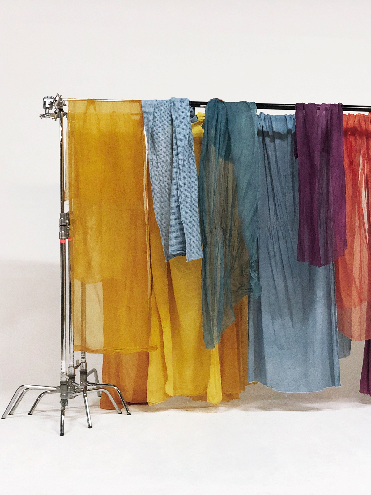 We turned the white fabric into a colorful range of different shades using indigo, marigolds, onion skins, avocado pits, cochineal, and madder root to mimic the Miami’s sky from sunrise to sunset.